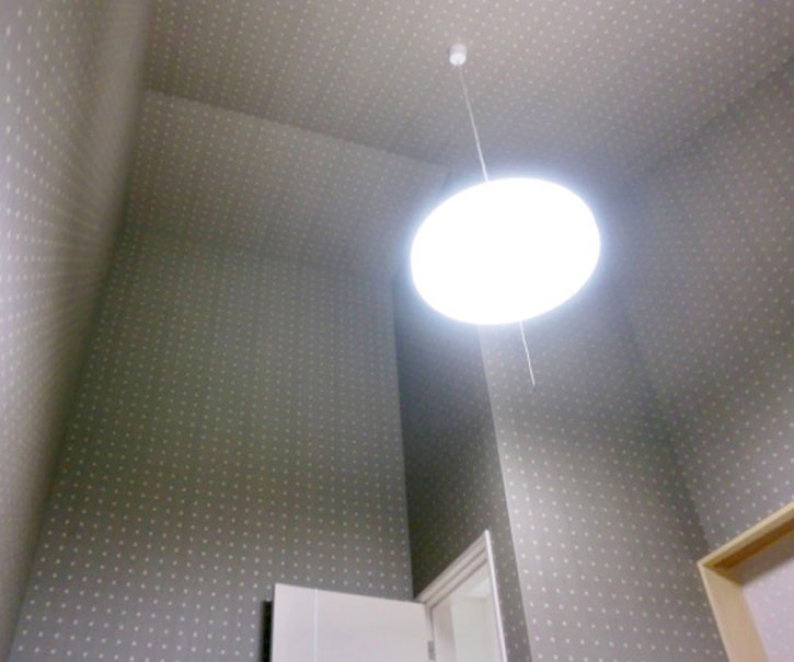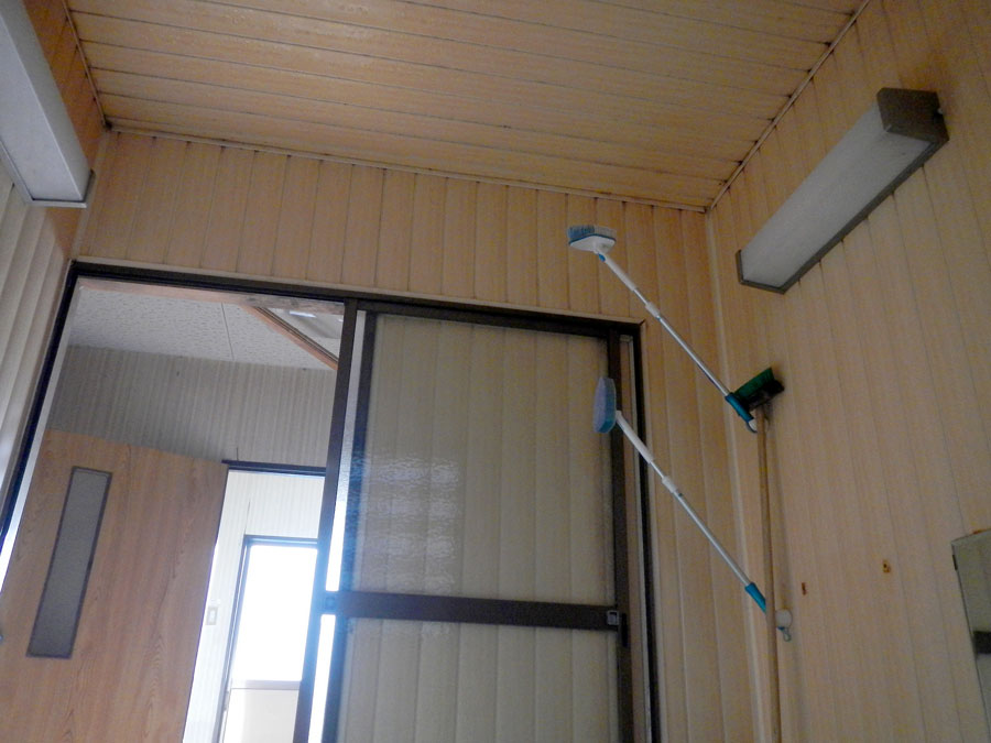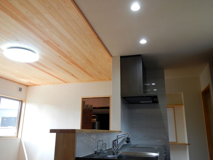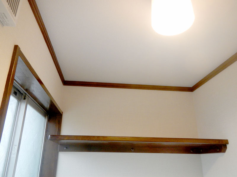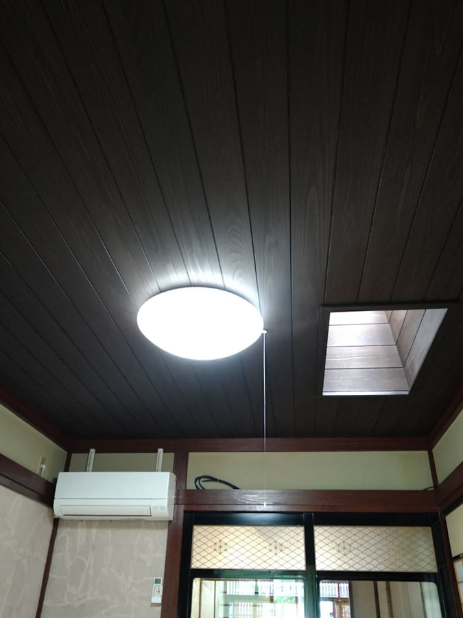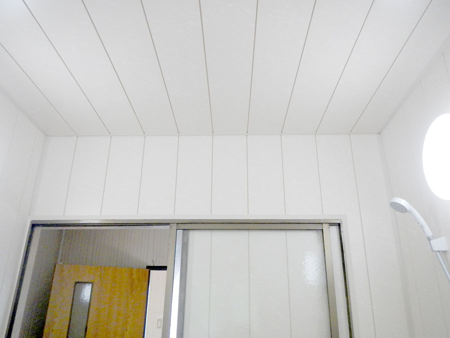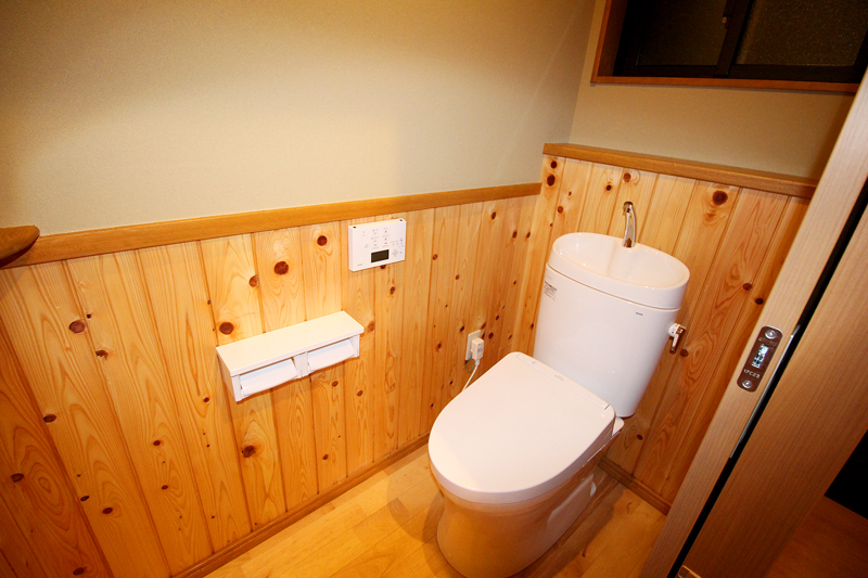 天井のクロスが劣化していたため、板に貼り替えました。 トイレの壁を腰板貼りにしました。