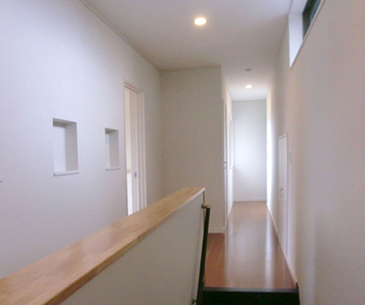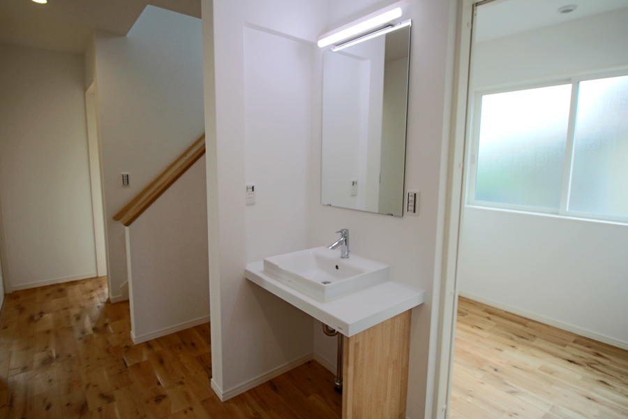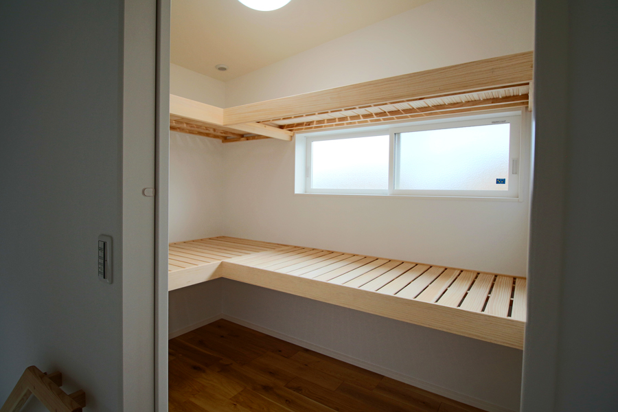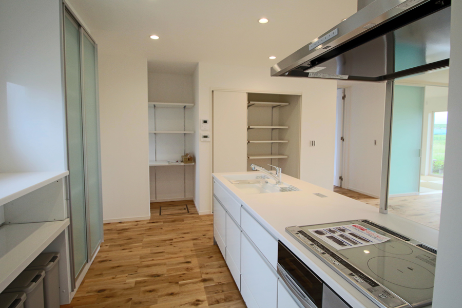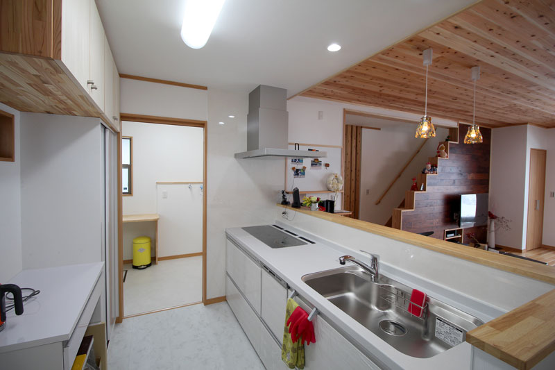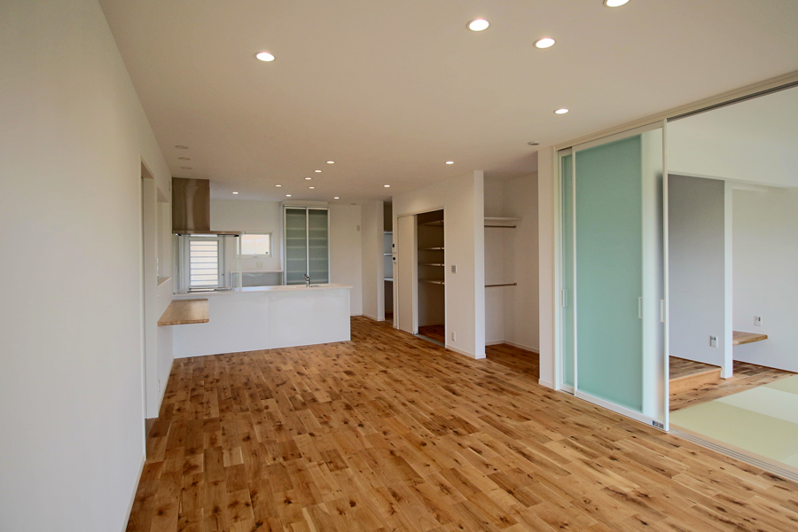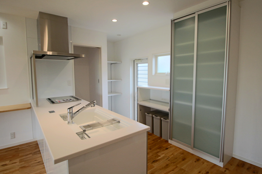 白を基調として、床は無垢のフローリングにしました。奥様は収納や棚を気になさっていたため、間取りも希望通りになるように設計しました。