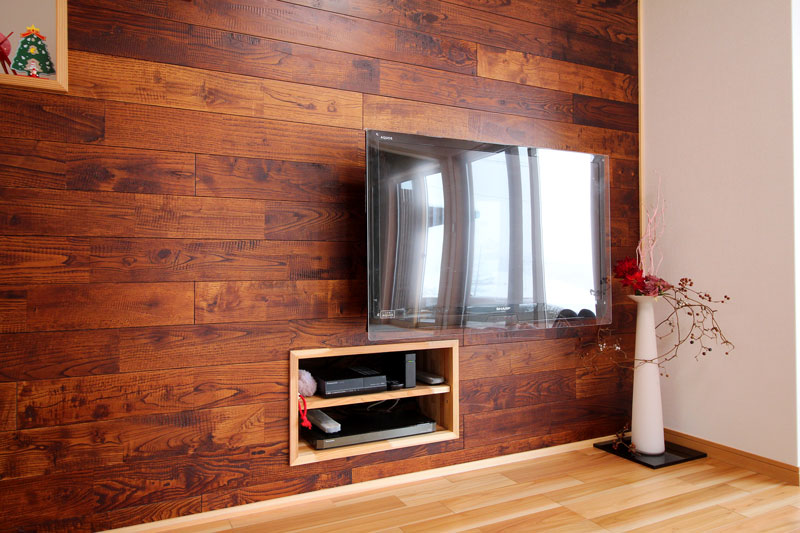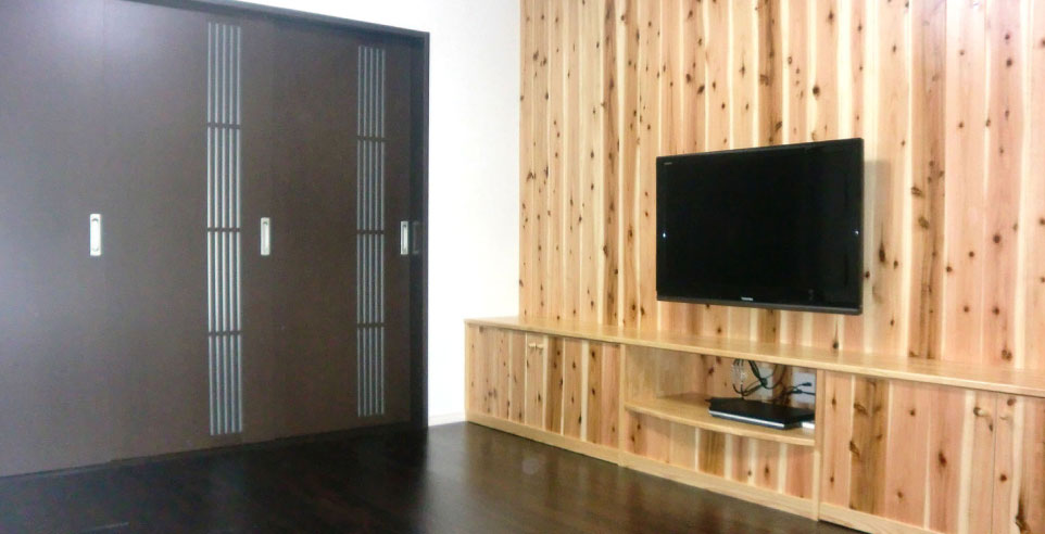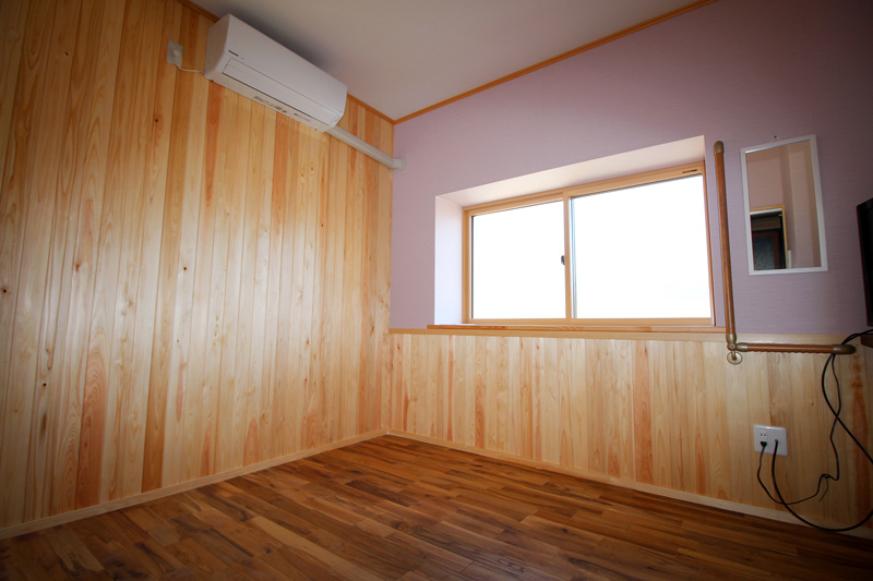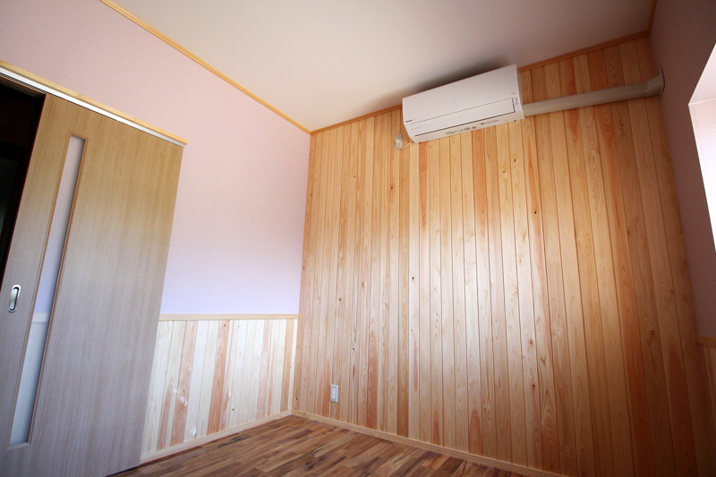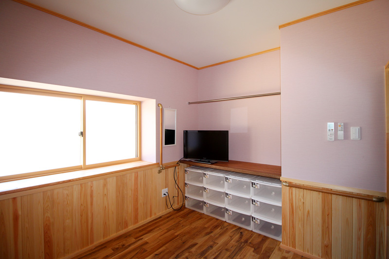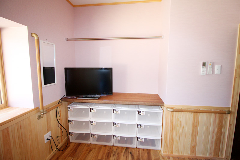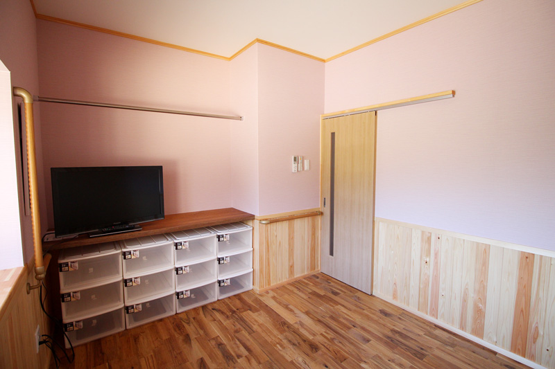 昔ながらの洋室を奥様の寝室に改装しました。 ピンクの壁がかわいらしく、気分がうきうきします。 部屋を有効に使いたいので、テレビを置くカウンターの下に少し収納をできるスペースを設けました。