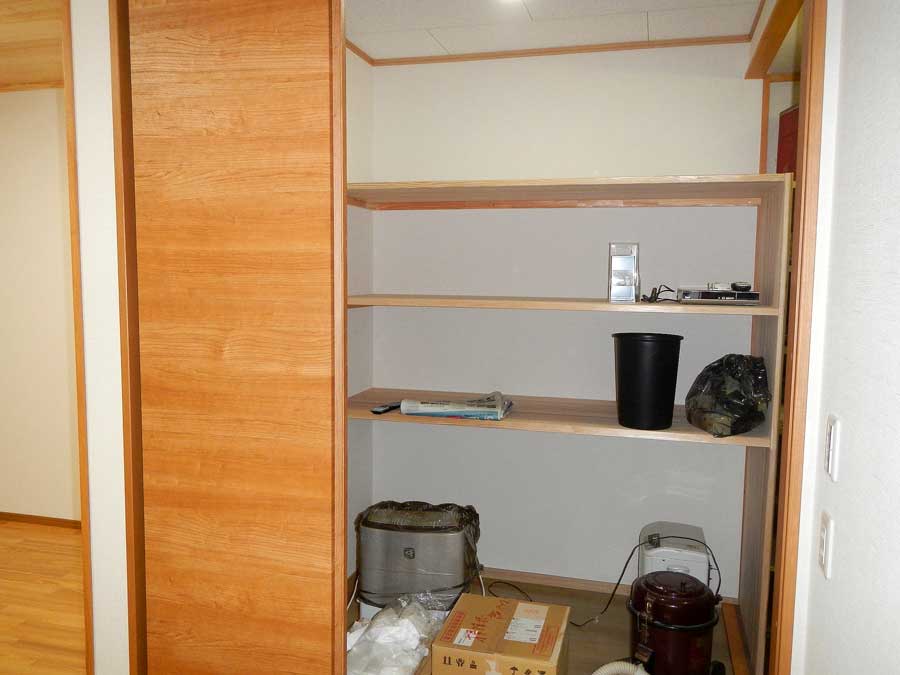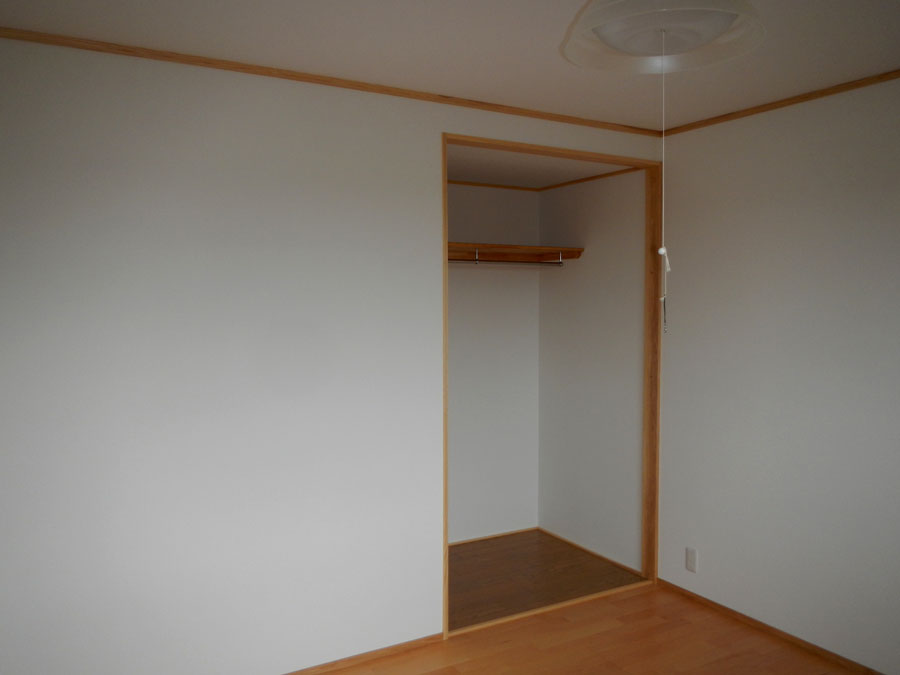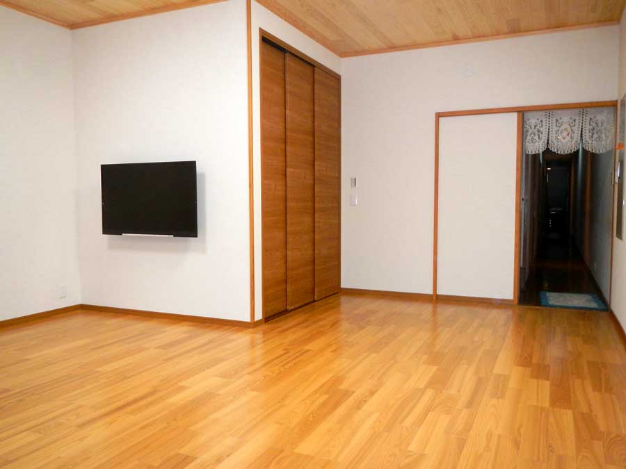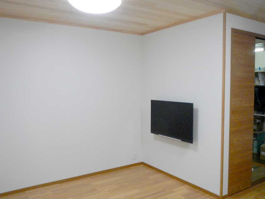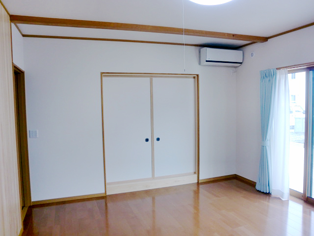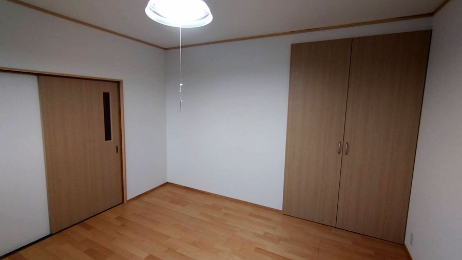 以前畳を床に替えた部屋を、今回は壁や天井をクロスに替えました。 収納部分が3つに分かれていて使いにくかったみたいですが、1つの大きなクローゼットに替えました。 すっきりした印象です。