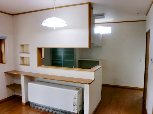 ダイニングキッチンの床暖が壊れたとのことで、修繕しました。 あまり使わない吊戸棚をやめ、カップボードを置きました。 下がり壁を取り払ったことで空間が生まれ、広く感じられます。