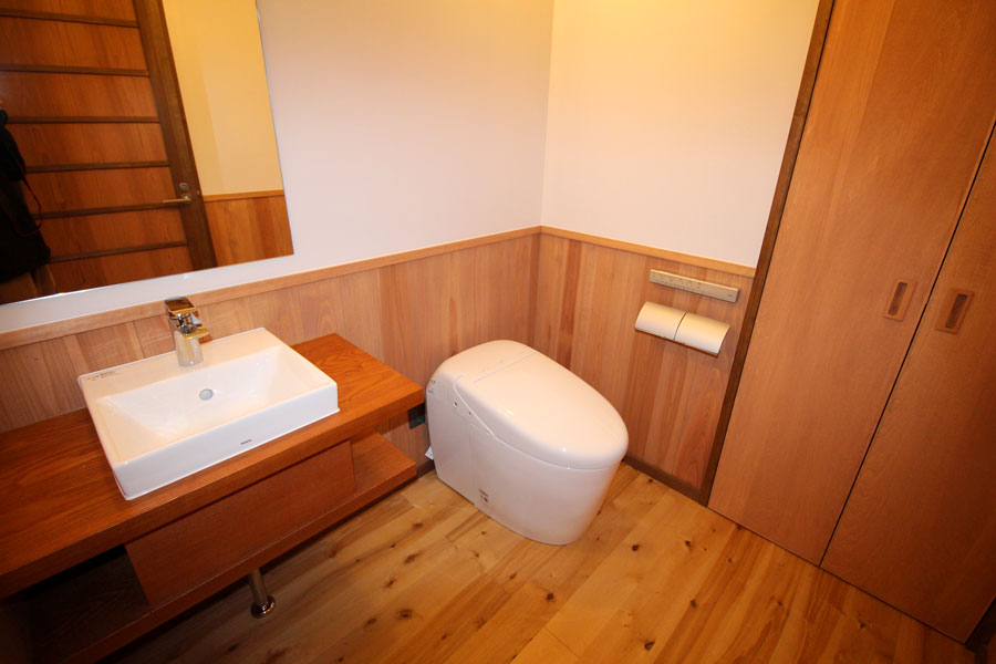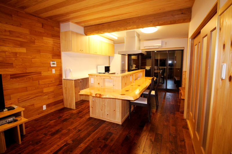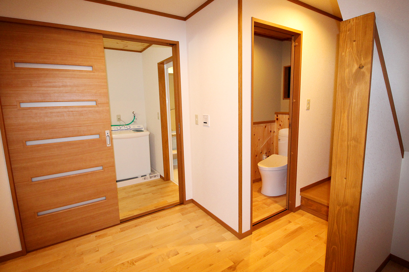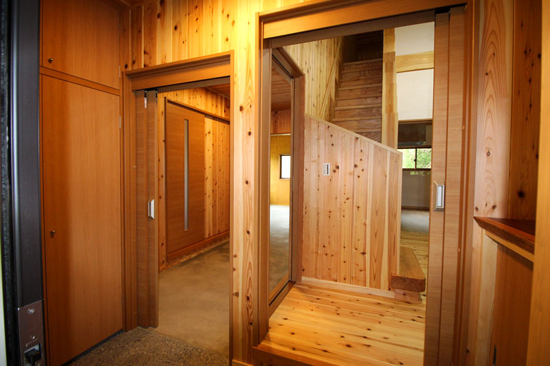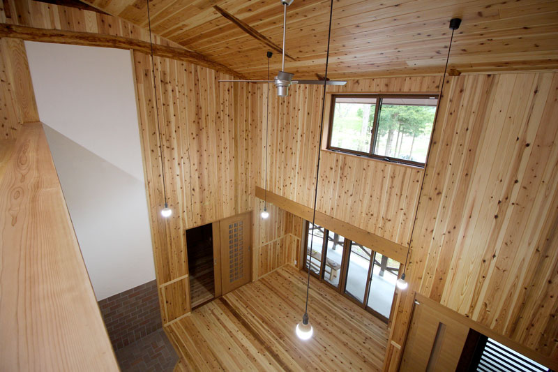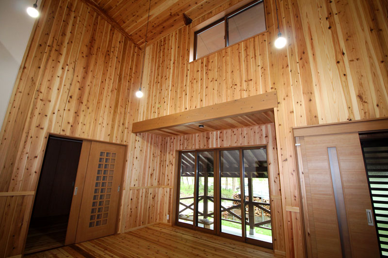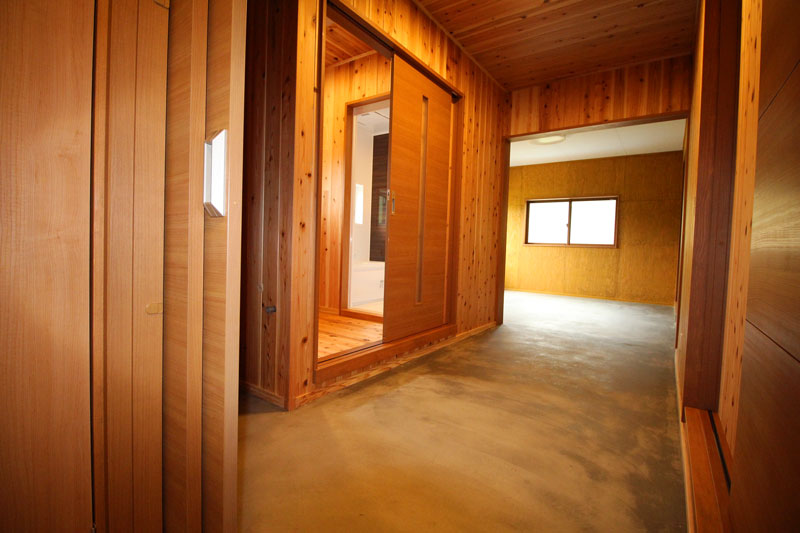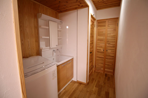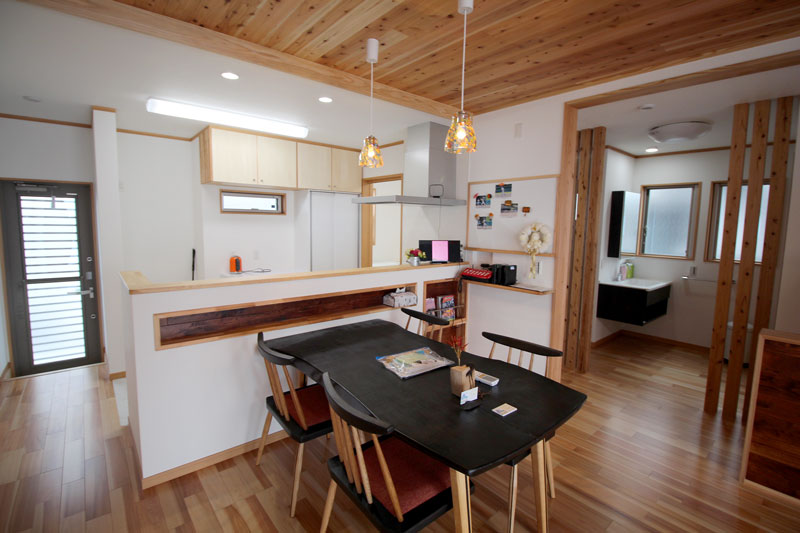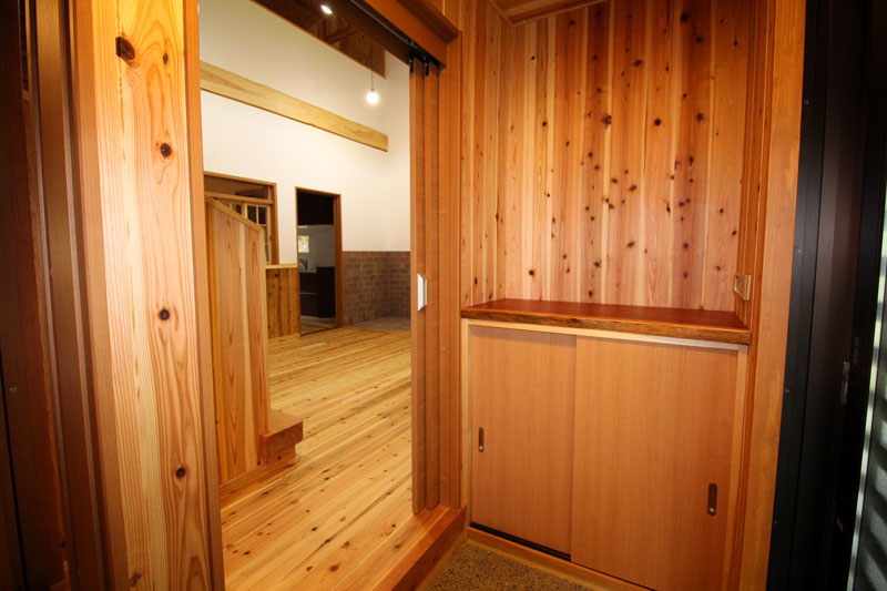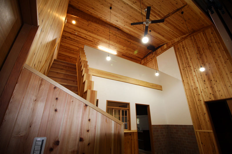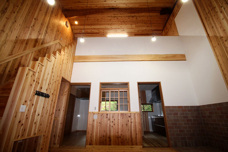 夫婦二人、農作業のしやすさを考えて、広い土間スペースをつくり、農作業の汚れを住居部分に持ち込まないように土間にトイレやバスルームをつくりました。 木をふんだんに使い、温かみのある空間に仕上げました。