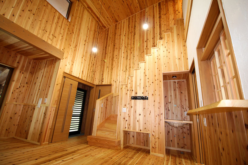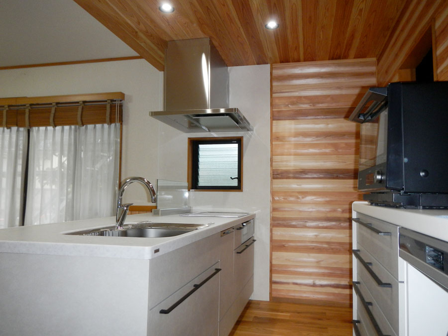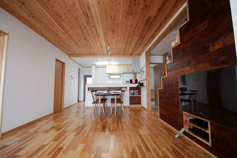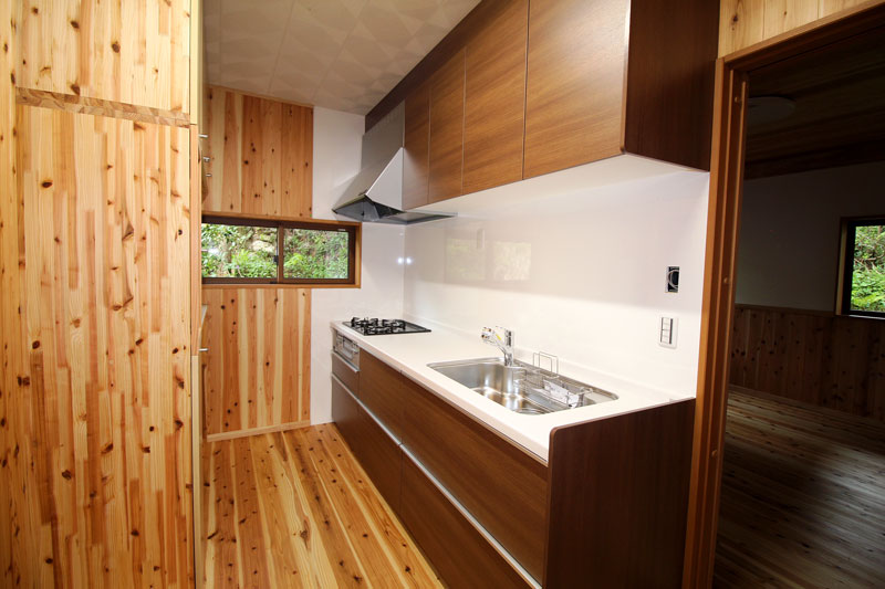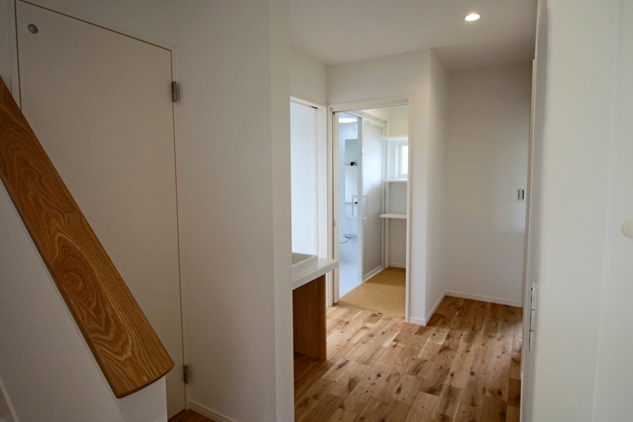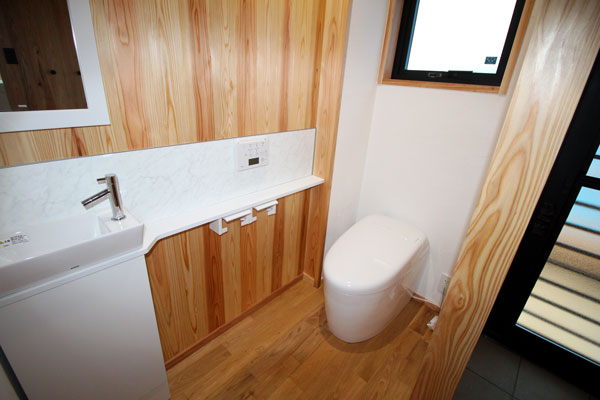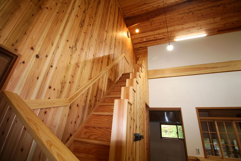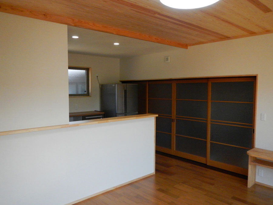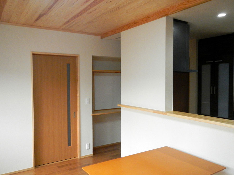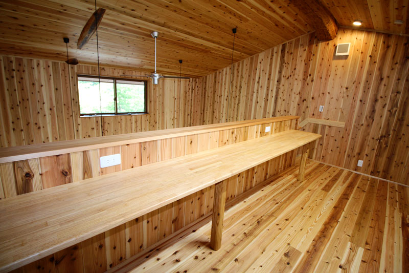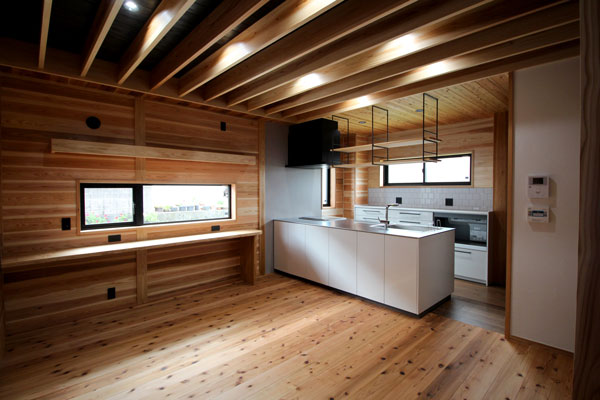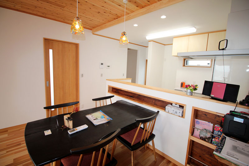 夫婦二人、農作業のしやすさを考えて、広い土間スペースをつくり、農作業の汚れを住居部分に持ち込まないように土間にトイレやバスルームをつくりました。 木をふんだんに使い、温かみのある空間に仕上げました。