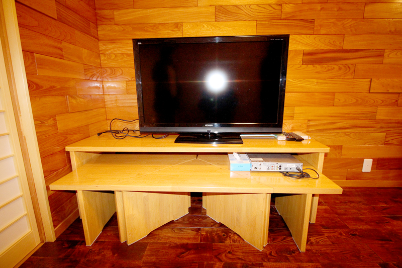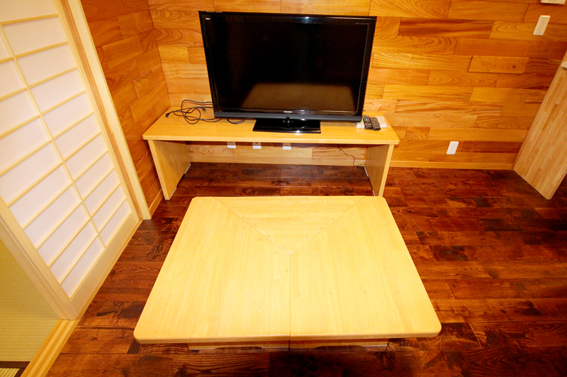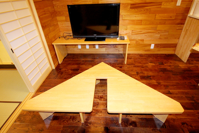 奥様の希望で、眺めの良い窓側にキッチンを配しました。 のんびりお茶を飲みながら、窓から見る眺めは最高です。 もう一つは、収納できるテーブルです。 使わないときはテレビ台の下に収納でき、広々とした空間が生まれます。 使いたいときは出して、好きなように配置して使います。