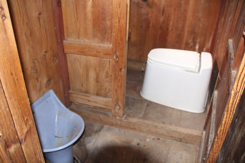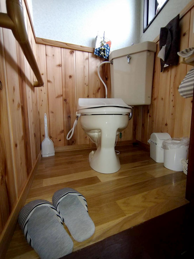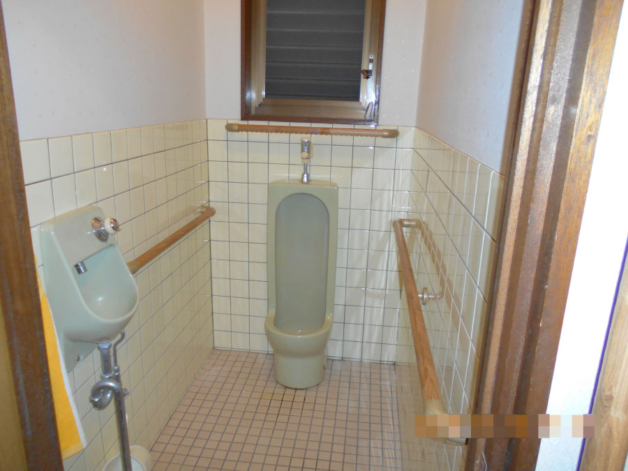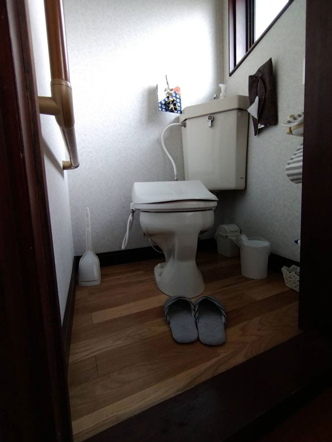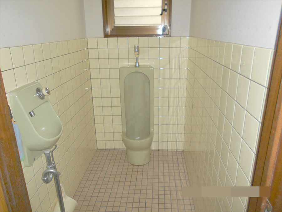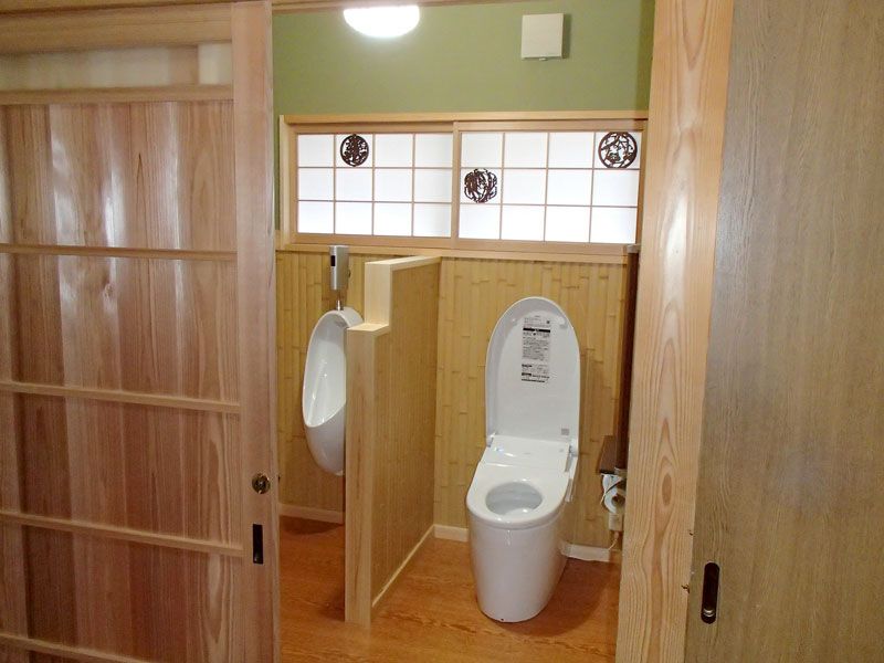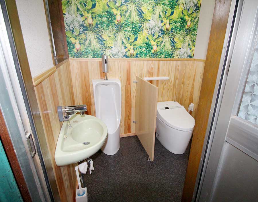 30年以上使って小便器の水の流れが悪くなり、一段高くなったところにある和式トイレも使い勝手が悪かったので改装しました。便器を替え、タイル張りだった床と壁はクッションフロアと板を張ったりして温かみのある感じになりました。