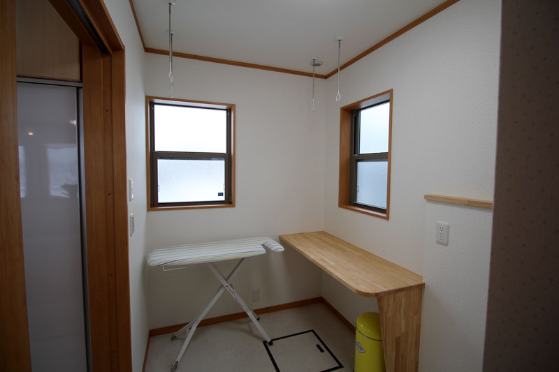 夫婦 + 子供2人 奥様の希望、家事導線を優先にした間取りです。 水廻りや勝手口を一か所に集中させました。 リビングと和室がつづいているので、限られた空間ですが広々と感じます。