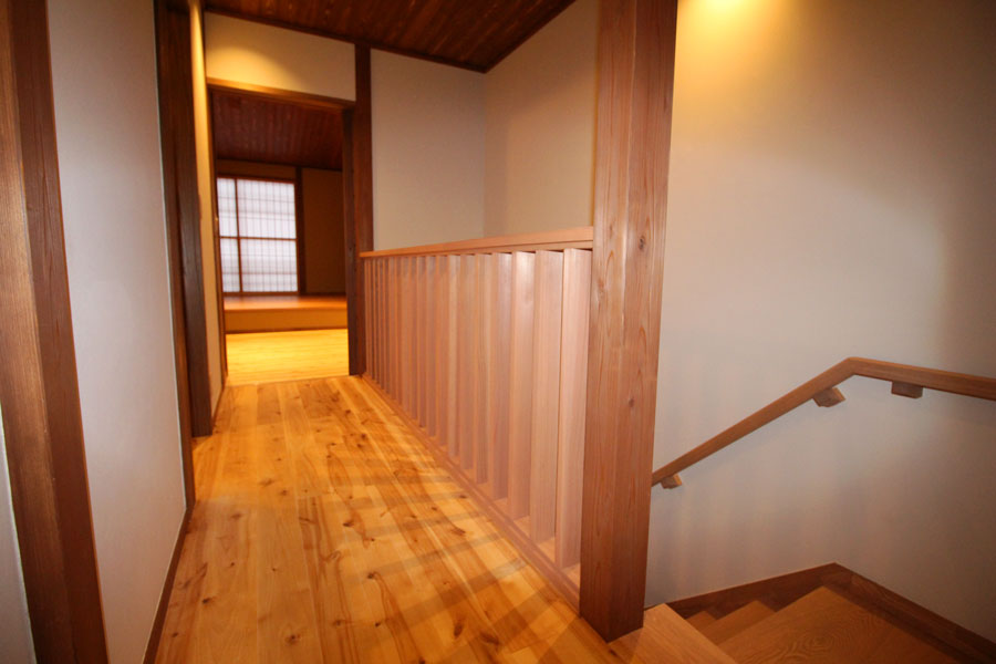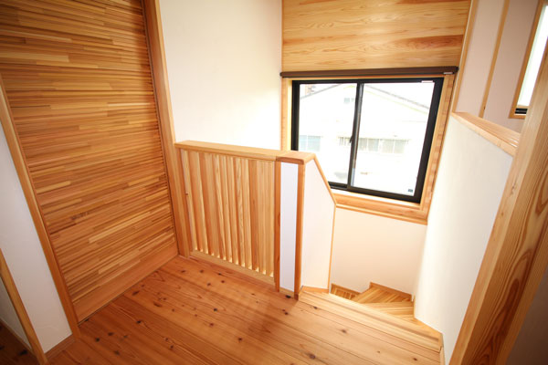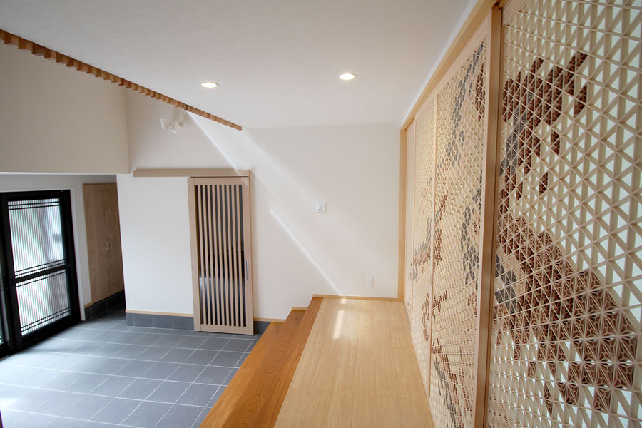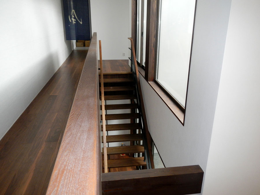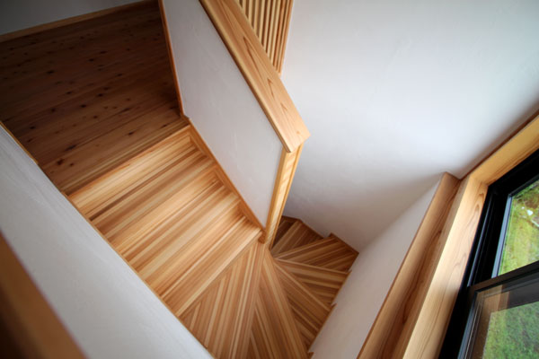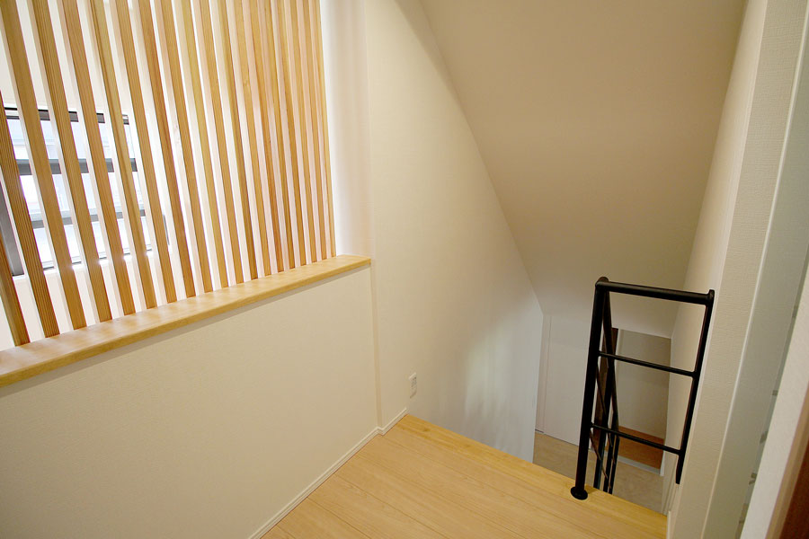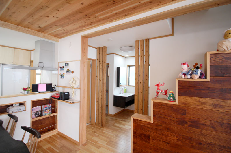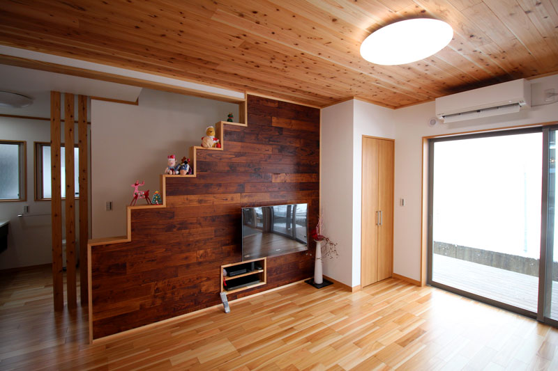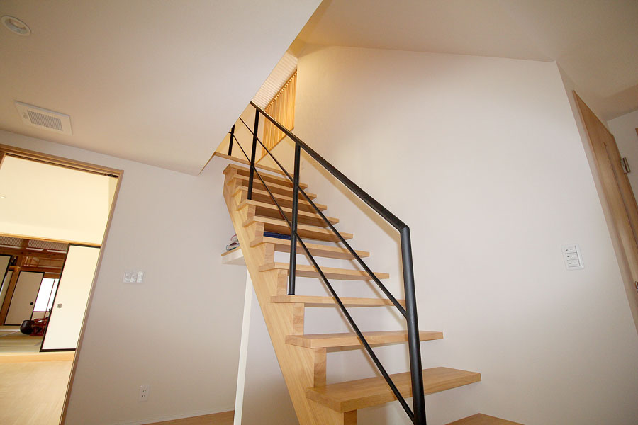 立山が一望できる東側にリビング、そしてお風呂に入りながらその素敵な景色を眺めたいとの希望で、部屋を配置しました。 猫を飼っていらっしゃるので、猫が遊べるように階段の手すりを階段風にし、和室の天井は木の色を生かし、モダンな感じに仕上げました。