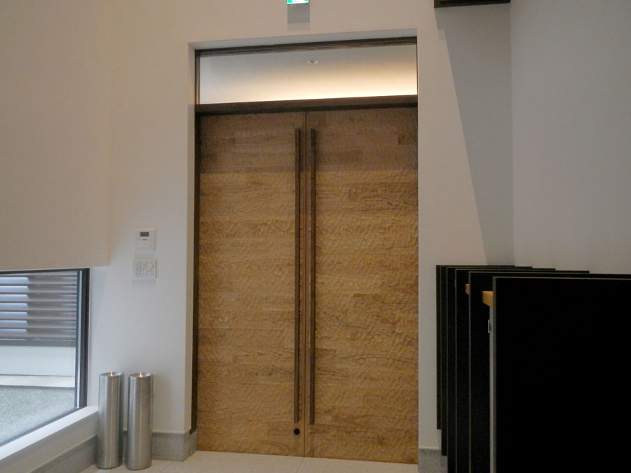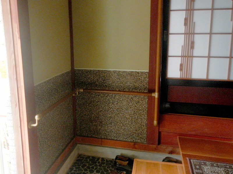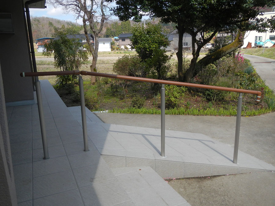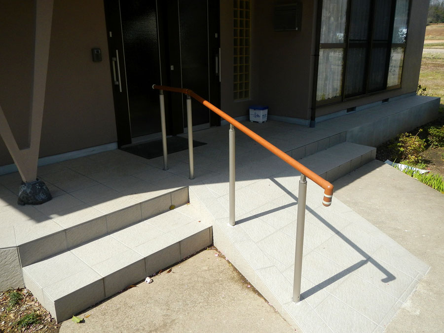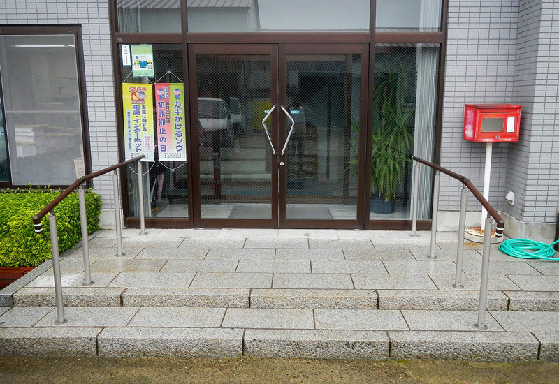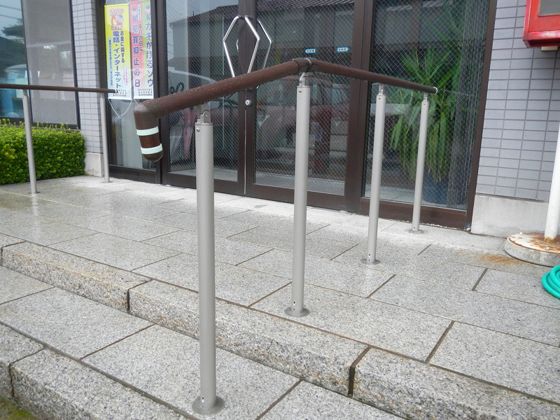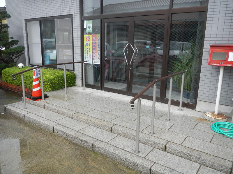 幅広い年齢層の方々が来社されるので、少しでも楽に段差を上がれるように手すりを取り付けました。