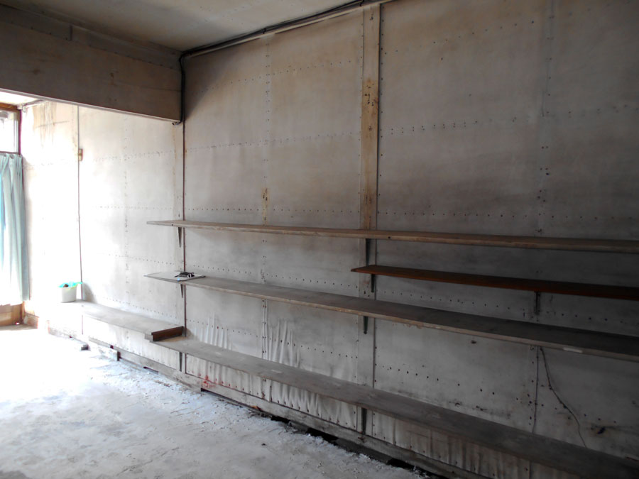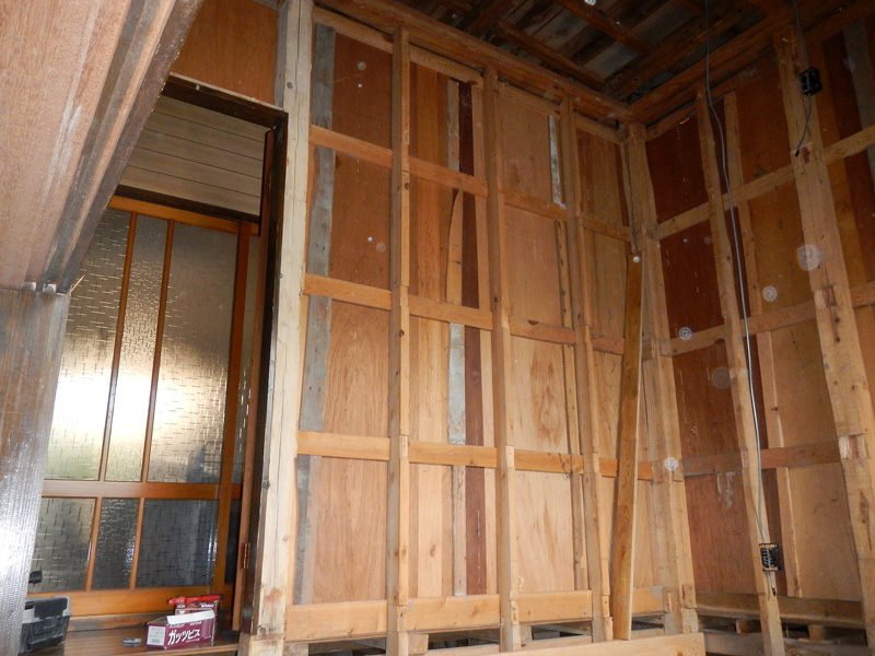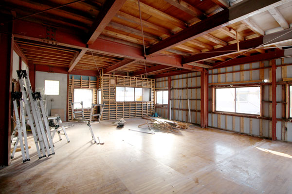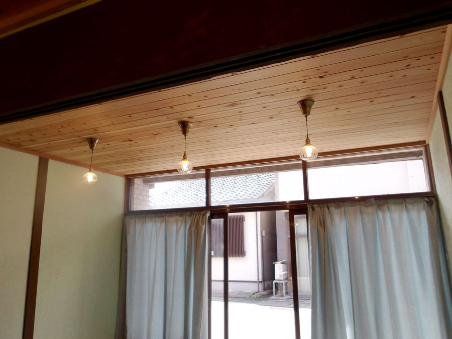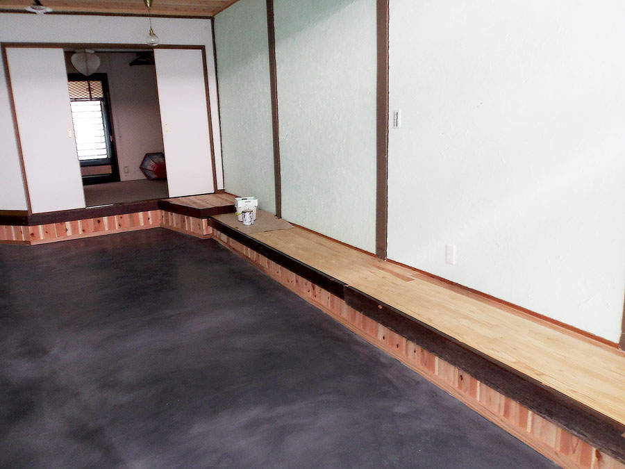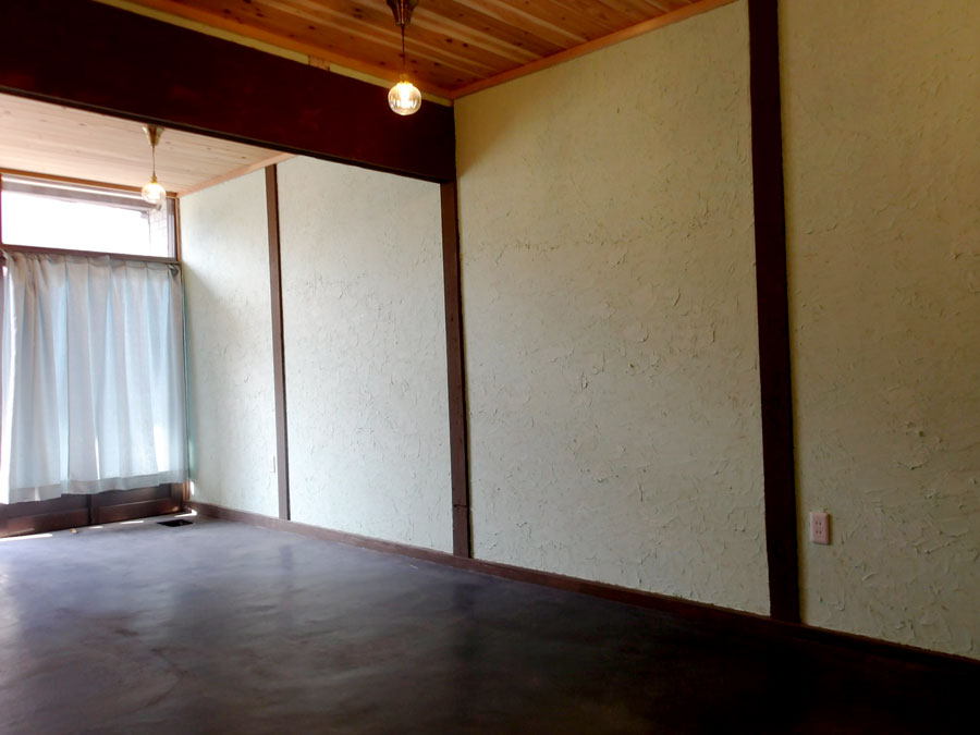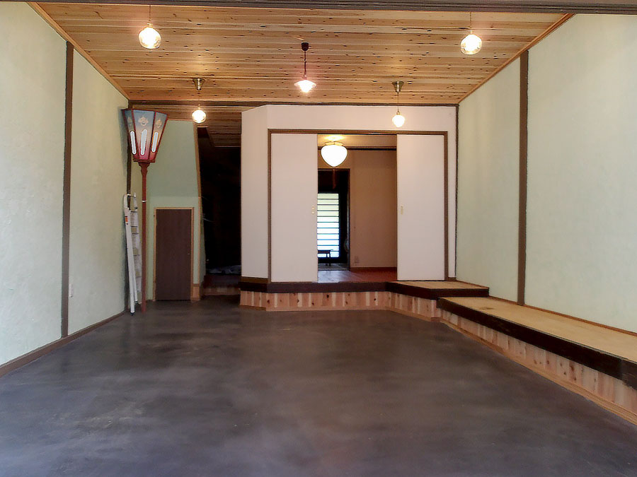 古い空き家をリフォームしました。 土間は黒のモルタル仕上げにし、天井は羽目板を貼り、壁はお客様がご自身で塗られました。