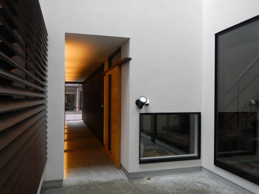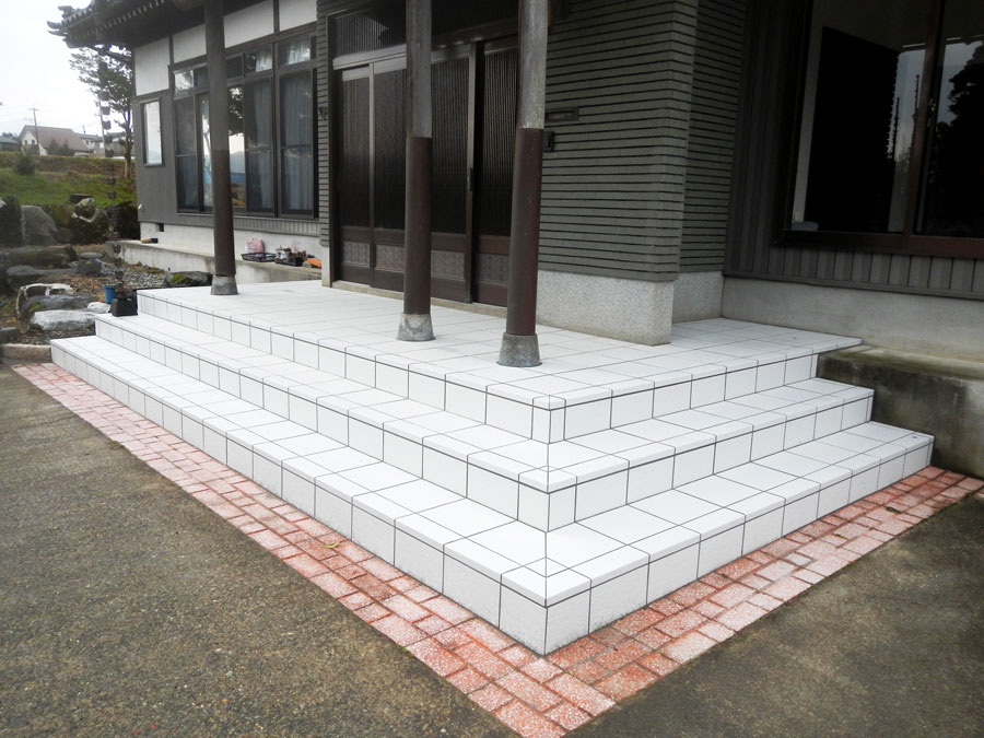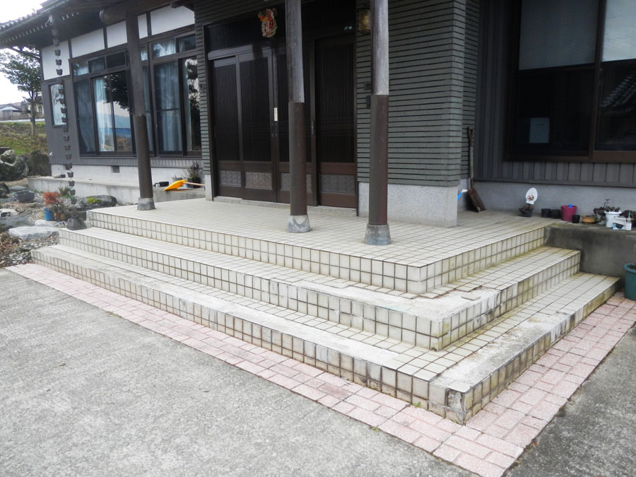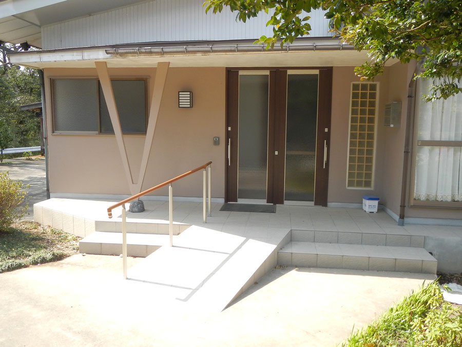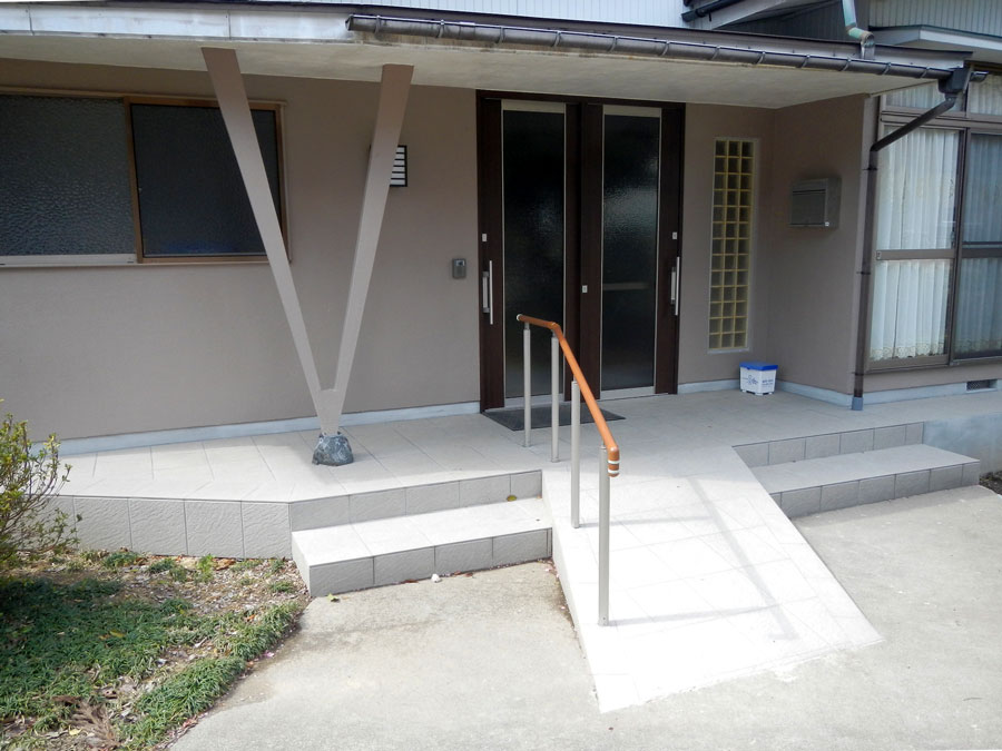 玄関前の壁を落とし新しく塗り、ドアを替えました。ポーチはタイルを張替、スロープを付けました。